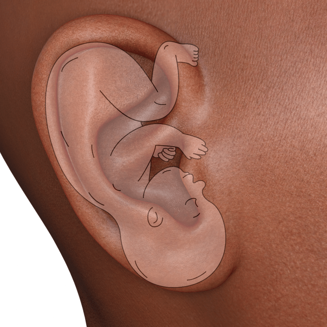 Selon la réflexologie, l’oreille représente le schéma d’un fœtus inversé :